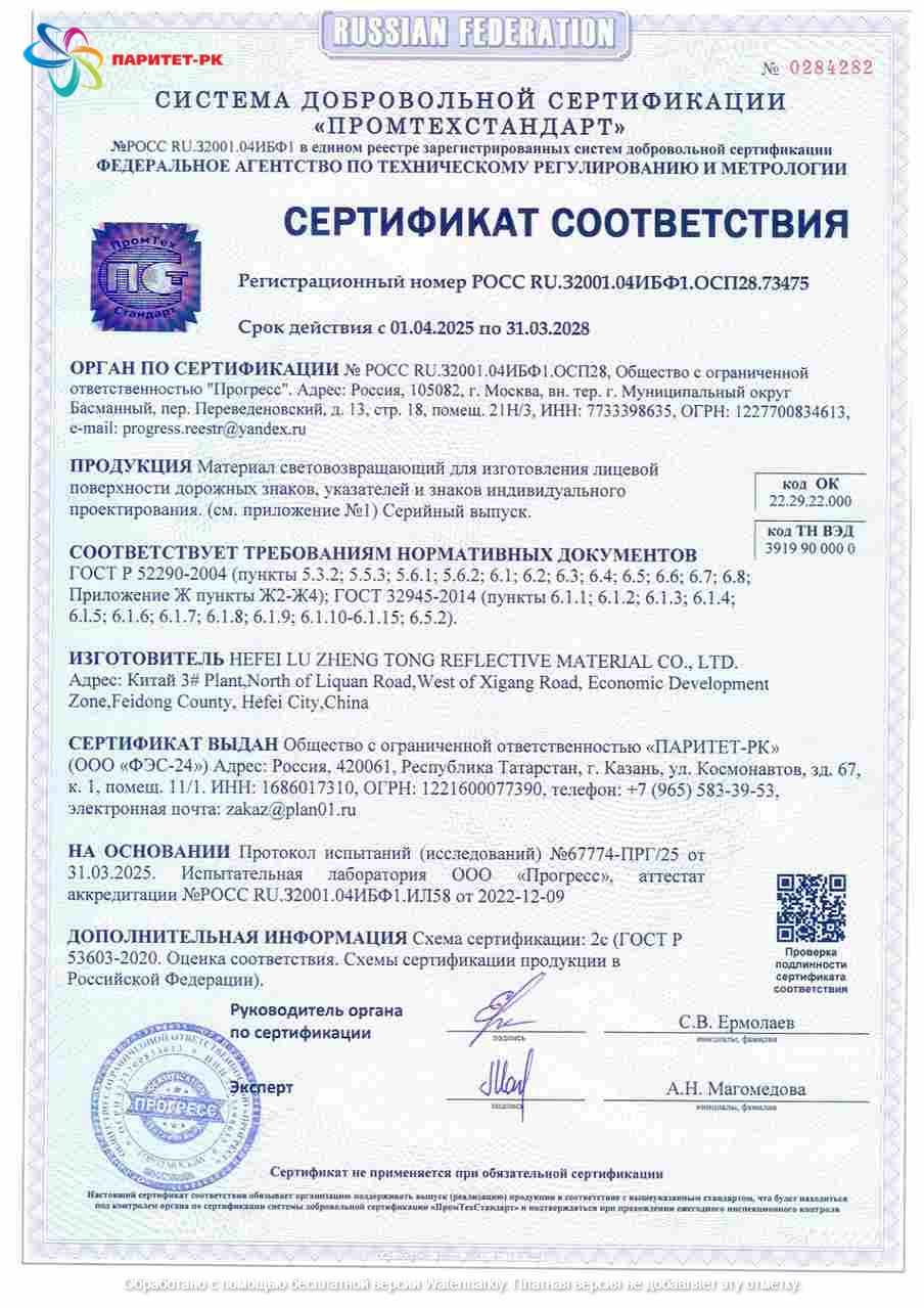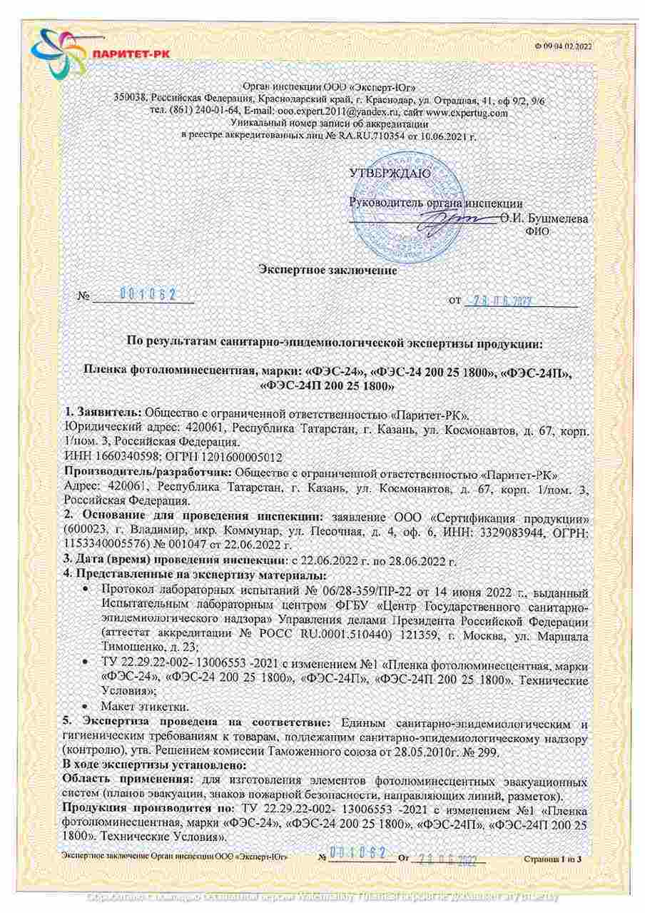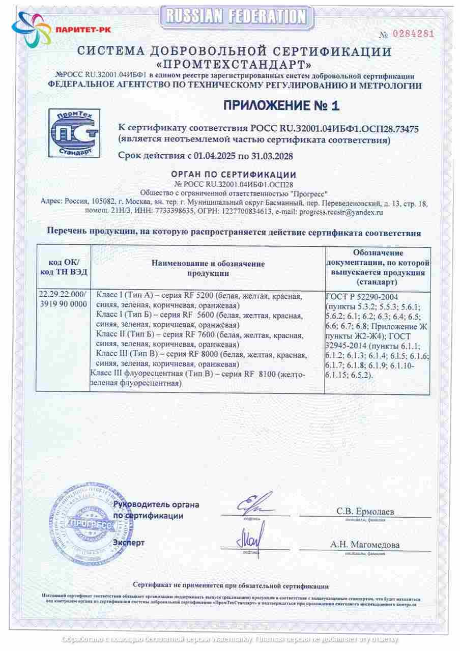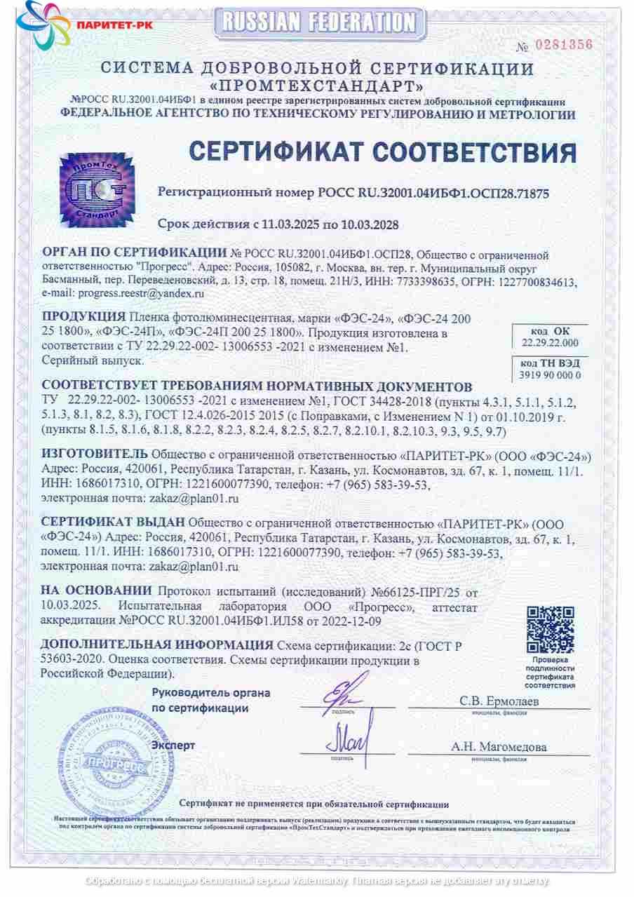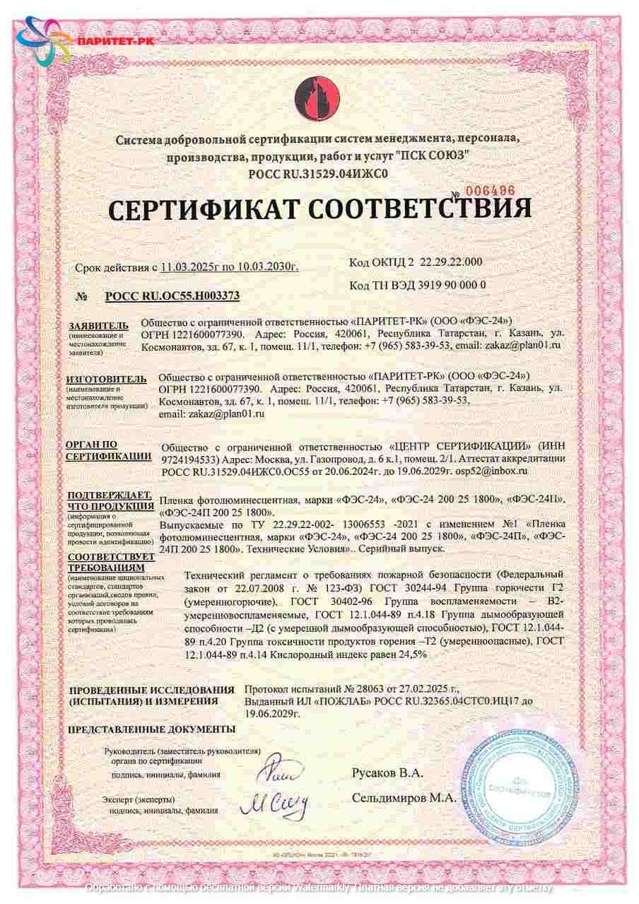 ООО "Паритет-РК" с 2012 года занимает лидирующую позицию на российском рынке фотолюминесцентной пленки. Мы выпускаем продукцию, соответствующую ГОСТ 12.4.026-2015 с изменением №1 от 01.10.2019 г. и ГОСТ 34428-2018, что подтверждено сертификатами безопасности.