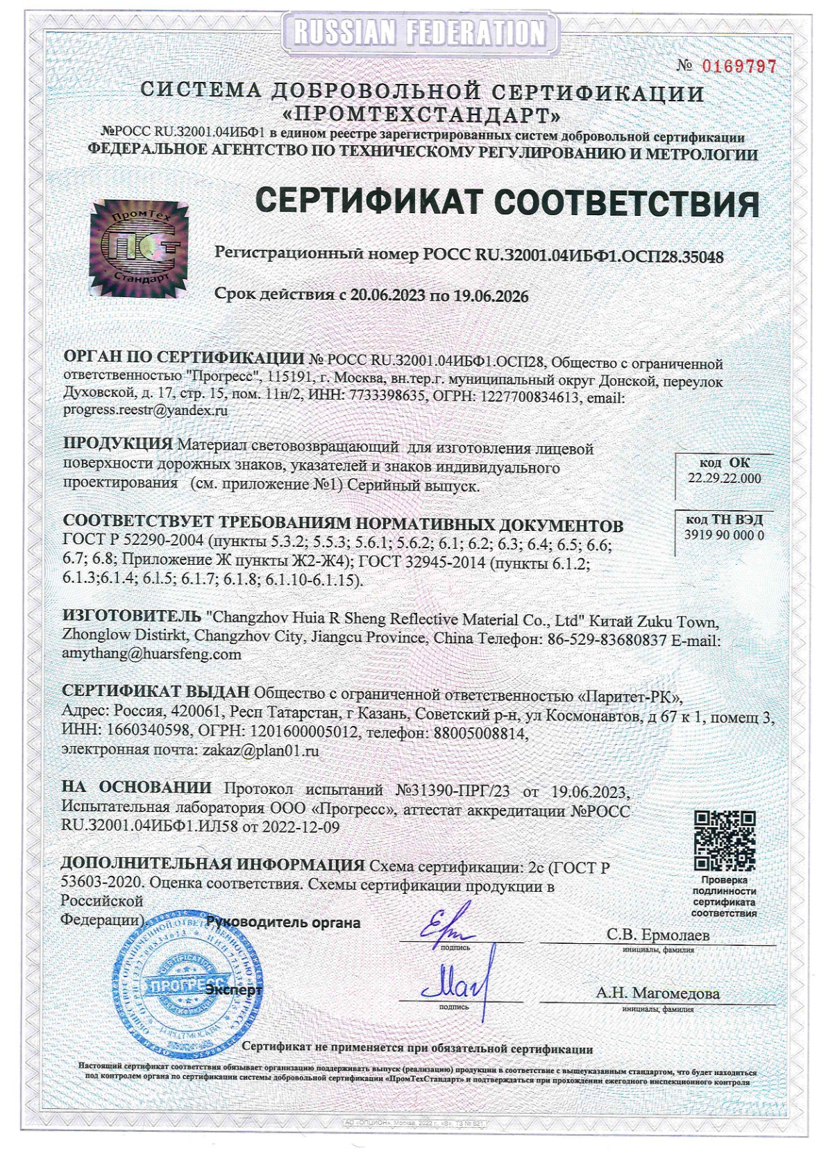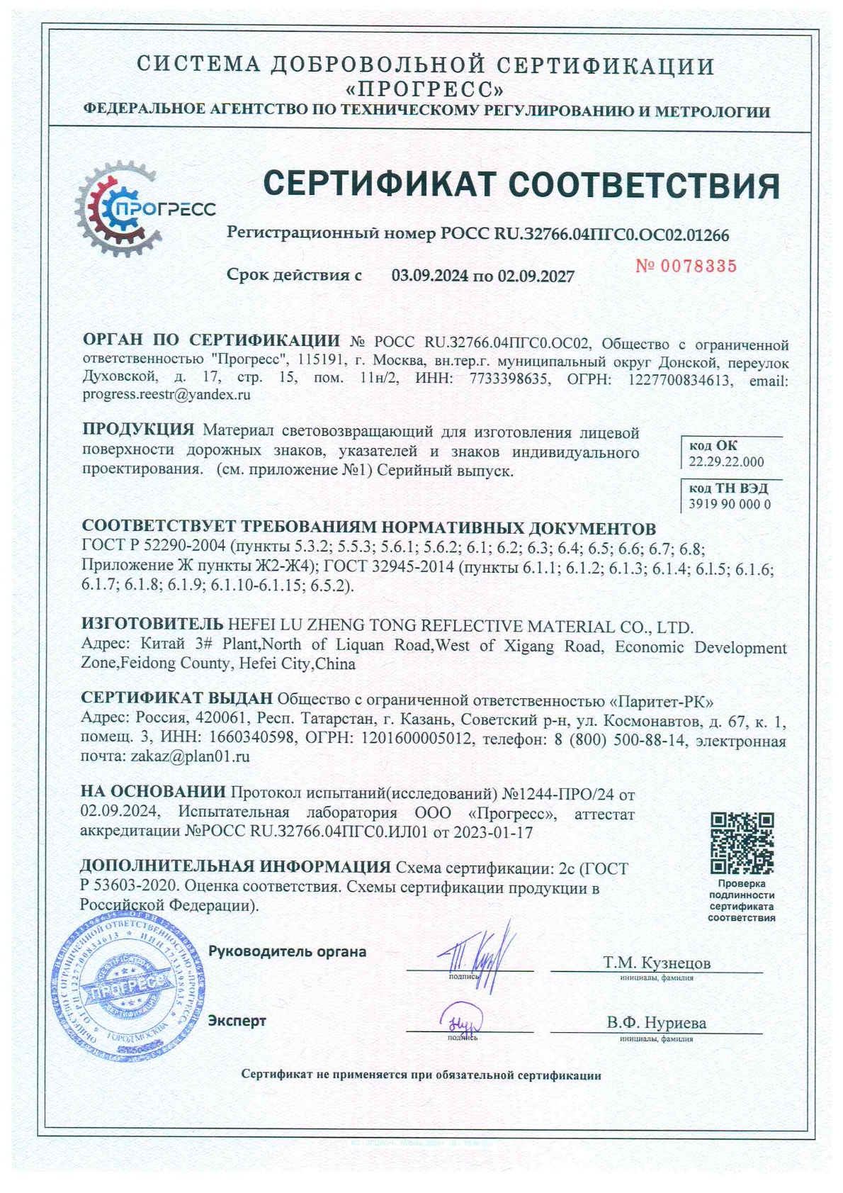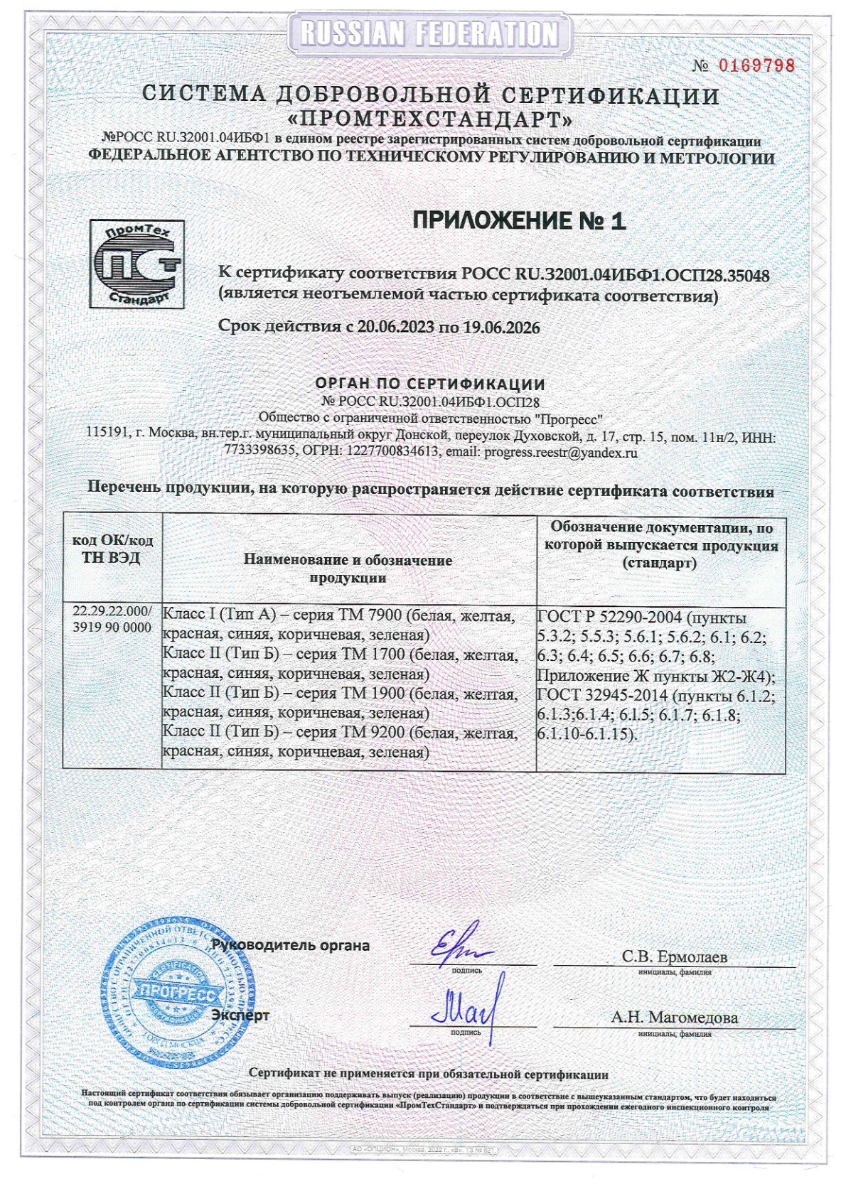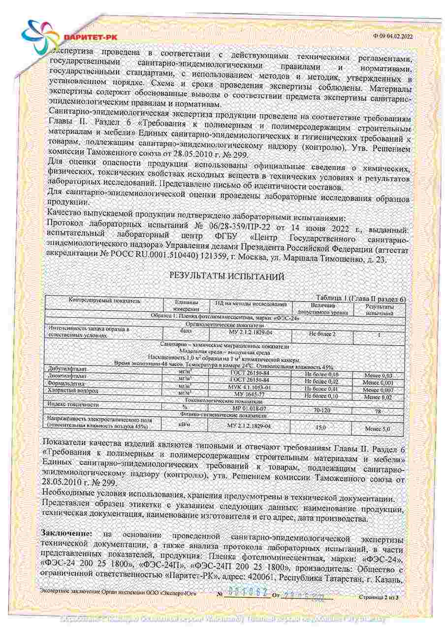 ООО "Паритет-РК" с 2012 года занимает лидирующую позицию на российском рынке фотолюминесцентной пленки. Мы выпускаем продукцию, соответствующую ГОСТ 12.4.026-2015 с изменением №1 от 01.10.2019 г. и ГОСТ 34428-2018, что подтверждено сертификатами безопасности.